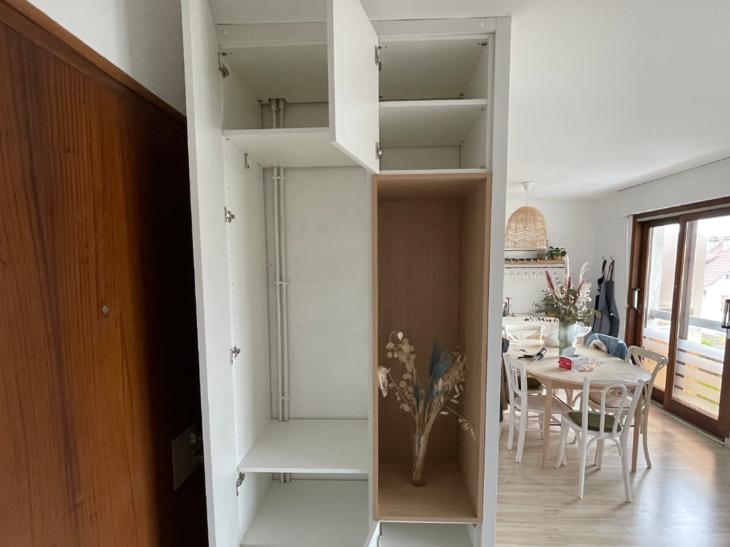 2ème étape : Concevoir et fabriquer un meuble esthétique et fonctionnel personnalisé au centimètre près, s’intégrant ainsi parfaitement dans le mur de l’appartement séparant l’entrée de la salle à manger.
