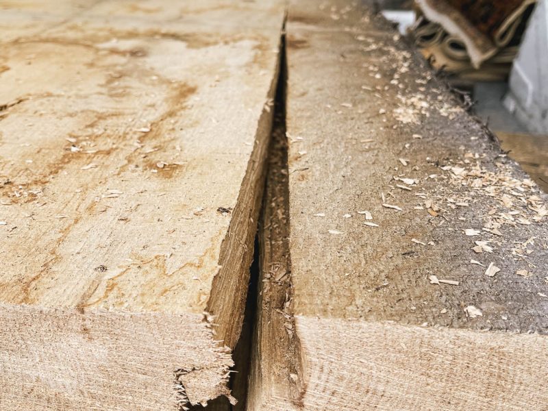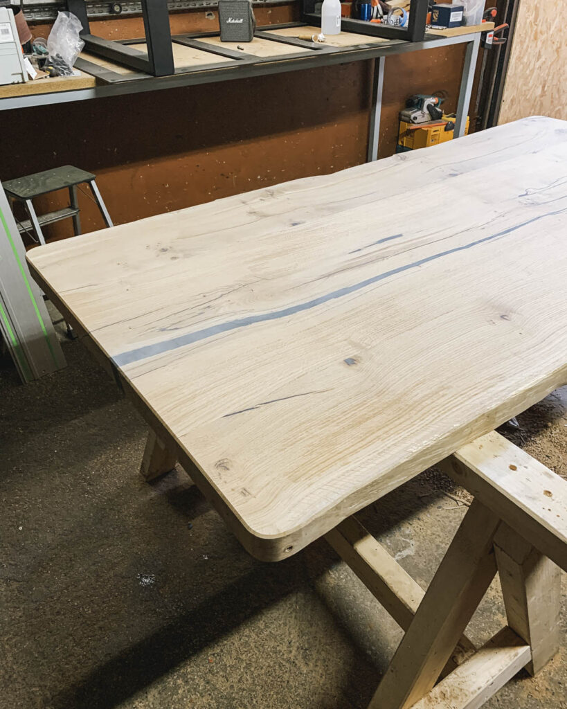 Second challenge pour cette table que nous nous étions imposé : dénicher un plateau d’un bois d’exception qui proviendrait d’un seul et même arbre ! Le caractère d’une table réside souvent dans sa matière, sa complexité, ses nœuds, ses fissures… et il est aujourd’hui ardu de dénicher de tels plots. Souvent les morceaux de bois proviennent d’arbres différents, au rendu forcément inégal. Avec un seul et même arbre, l’uniformité est assurée !